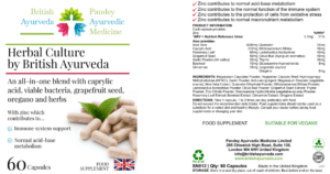 Magnesium Caprylate Powder; Vegetarian Capsule Shell: Hydroxypropyl Methylcellulose (HPMC); Garlic Pdr; Anti-caking Agent: Magnesium Stearate (vegetable source); Aloe Vera Ext (200:1); Quercetin Dihydrate Pdr; Bifidobacterium Bifidus Pdr; Lactobacillus Acidophilus Pdr; Clove Bud Pdr; Grapefruit Seed Ext (5:1); Thyme Pdr; Zinc Citrate; Glucosamine Hydrochloride (vegetable source); Rosemary Leaf Ext (10:1); Beetroot Ext (5:1); Cinnamon Ext (5:1); Oregano Ext (4:1).